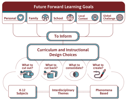 - Content cuts: The tendency to “cover” content needs to be confronted in order to move forward. Distinguishing content that directly supports and is central to the Future Forward Learning Goals and storyline might prove to be a great challenge but also a rewarding one. Of particular value will be to proactively have our learners show the connections between the key content and that storyline as the curriculum develops.